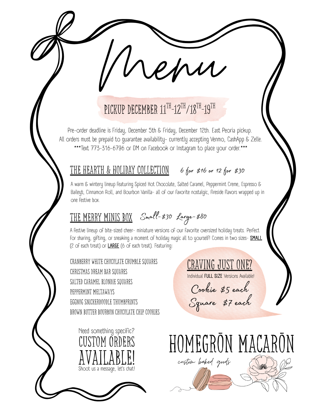 There’s always something in the works at Homegrōn Macarōn! Each month we roll out fresh treat releases—from seasonal flavors to holiday-inspired treats that only come once a year. Keep an eye out for our special holiday drops, monthly menus, and surprise flavors you won’t want to miss.